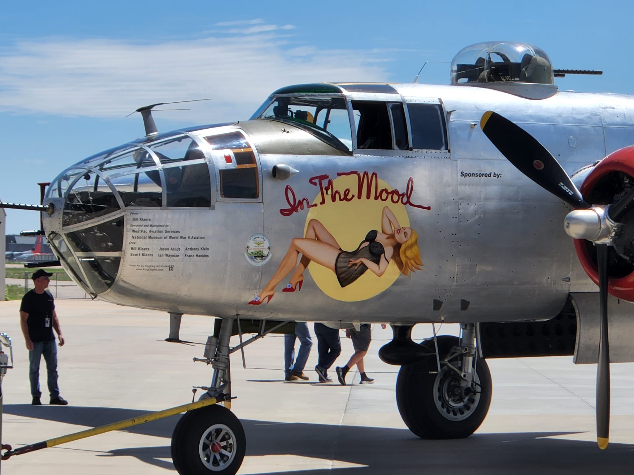 “In the Mood” was built on August 29th, 1944, in Kansas City and became a trainer, first at Turner Field in Georgia, and then at twelve other fields, until it became surplus in 1958. She was a spray tanker for about ten years. It has flown off several carriers, was in the movie Pearl Harbor and is the only B-25 to takeoff from a carrier in dry dock.