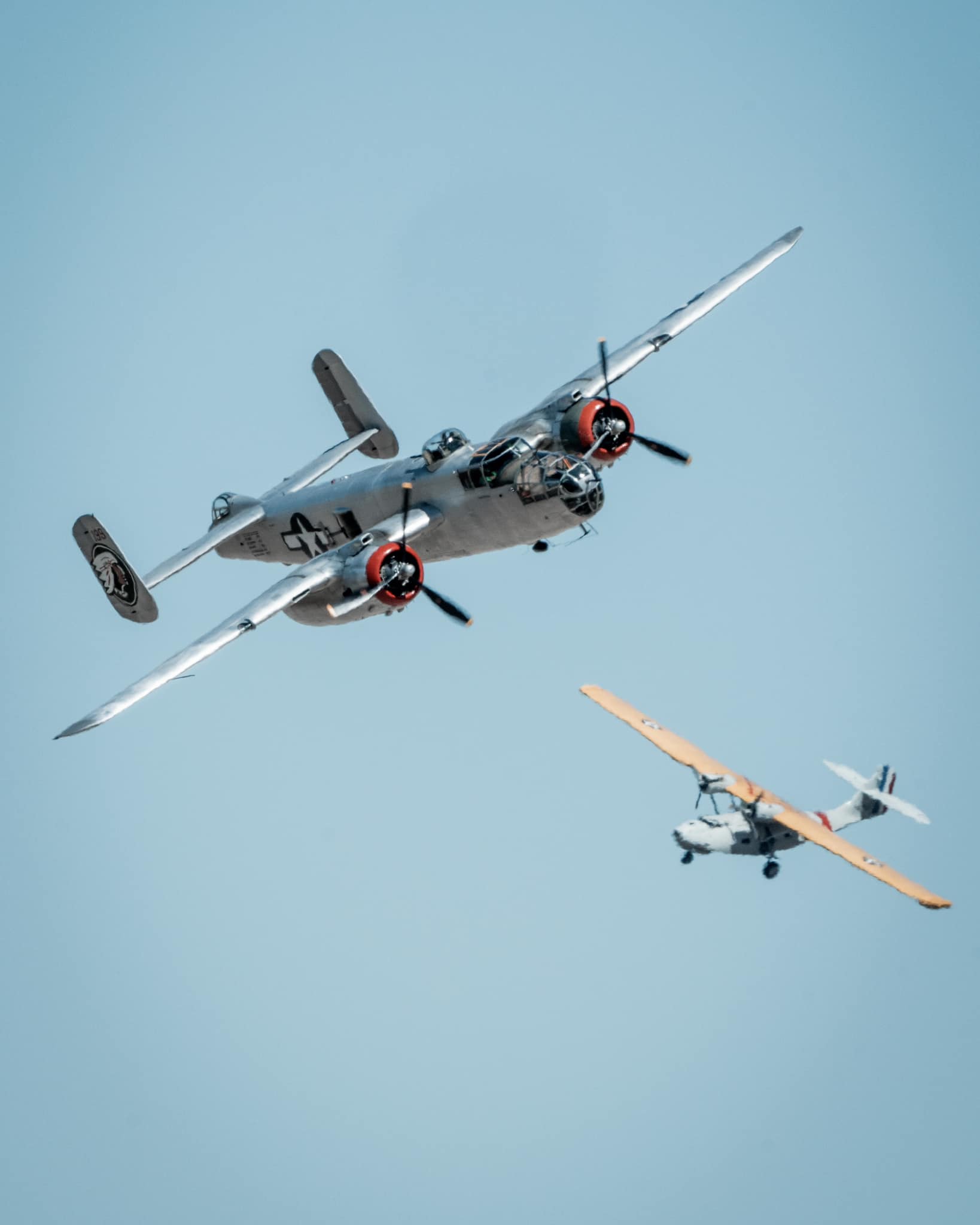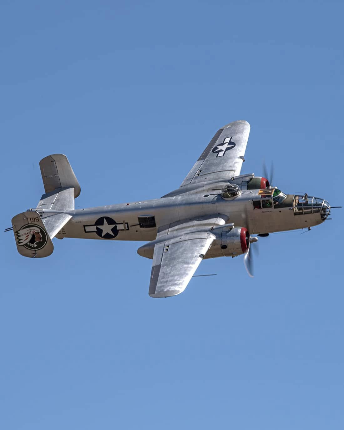 The B-25 became most famous for outstanding work in the Pacific Theater. There, specially modified aircraft carried eight (and sometimes more) machine guns that fired forward, attacking Japanese shipping and airfields. B-25s also skipped bombs off the water and into Japanese ships. The 345th Bomb Group—with the Air Apaches motif as on this B-25—carried on their bombing missions throughout the South Pacific.